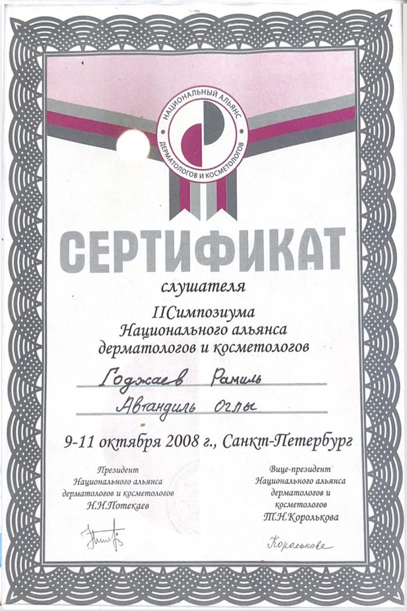 2008-Beynəlxaq Estetik Təbabət İnstitutu (Sankt-Peterburq,Rusiya)-botulinoterapiya,kontur plastikası,mezoterapiya, biorevitalizasiya,PRP,aparat kosmetologiyası