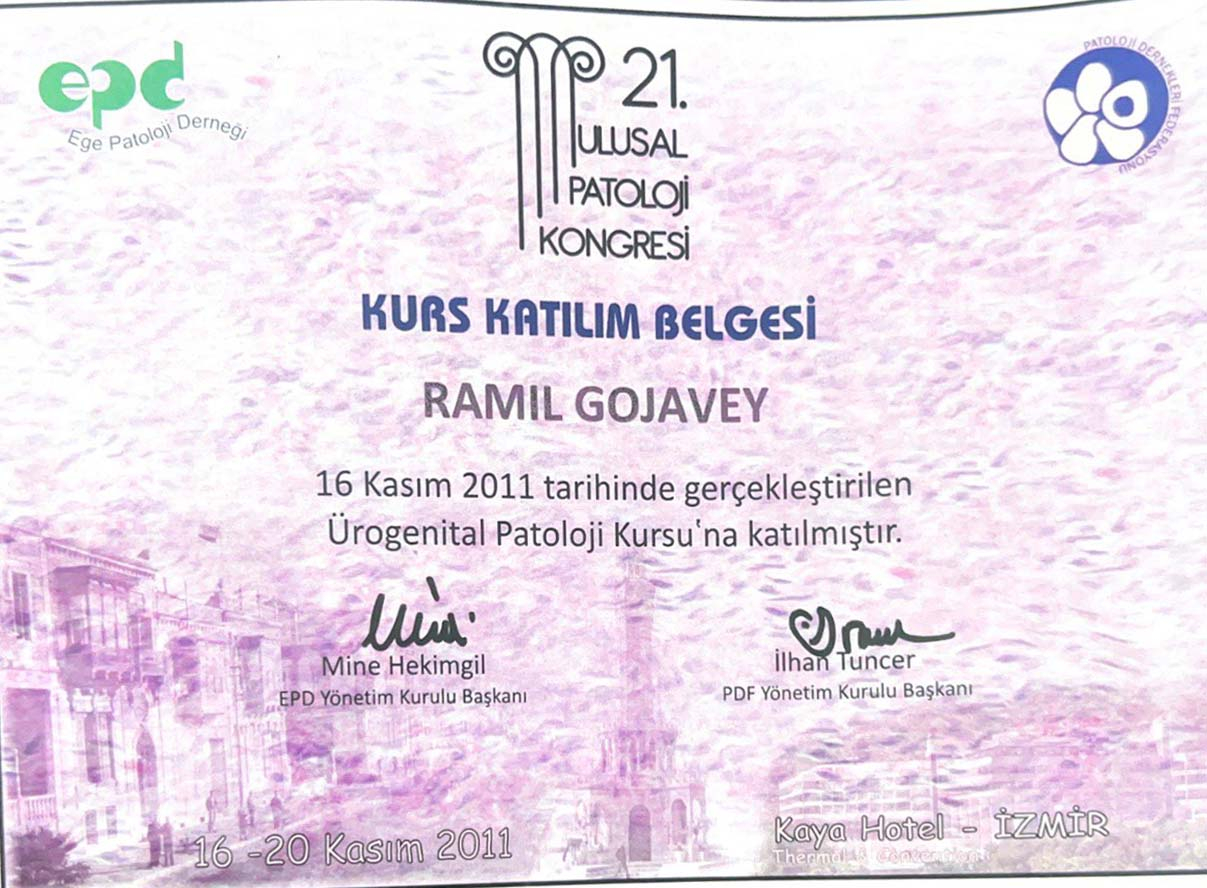 2013-cü il Türkiyə İstanbul özəl Kadıoğlu Hastanesi Dr.Serkan Aygin mərkəzində Saç Əkimi kursu keçib.
